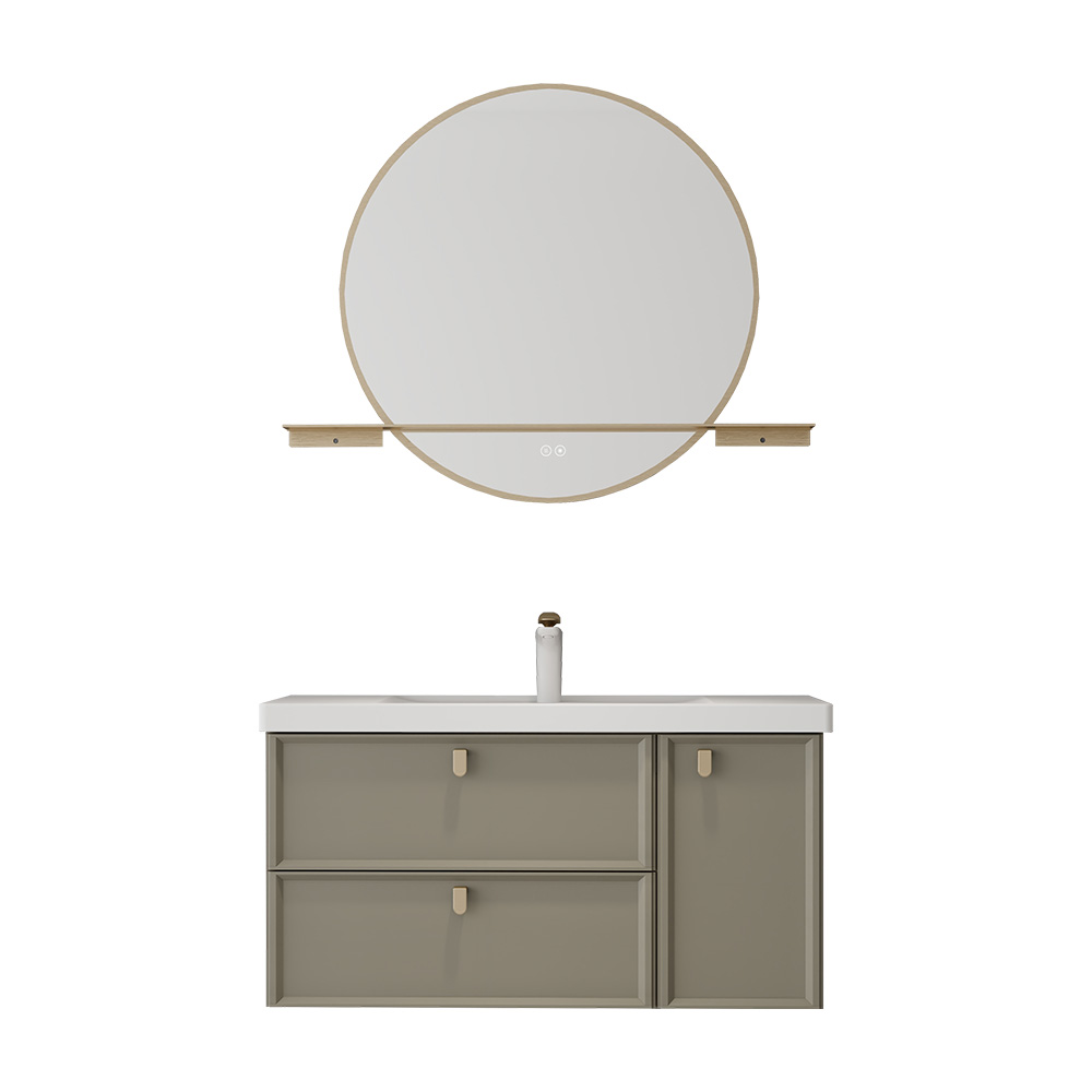 - 新中式设计元素:徽派建筑元素(吸塑造型门板提取马头墙元素,香槟金带纹理造型拉手提取飞檐和琉璃瓦元素),金属包边圆镜搭配触控氛围灯设计,传统与时尚碰撞,呈现新中式格调