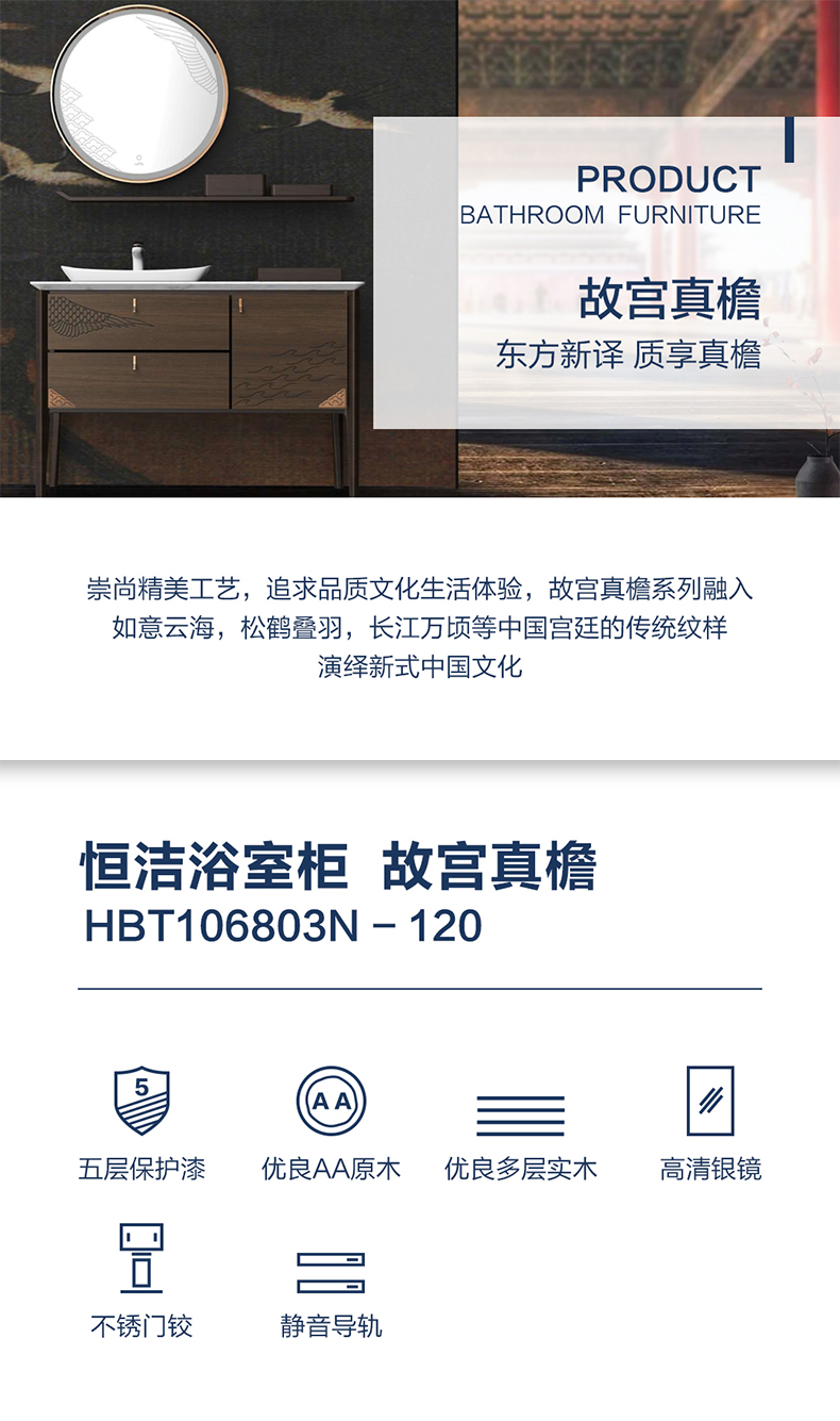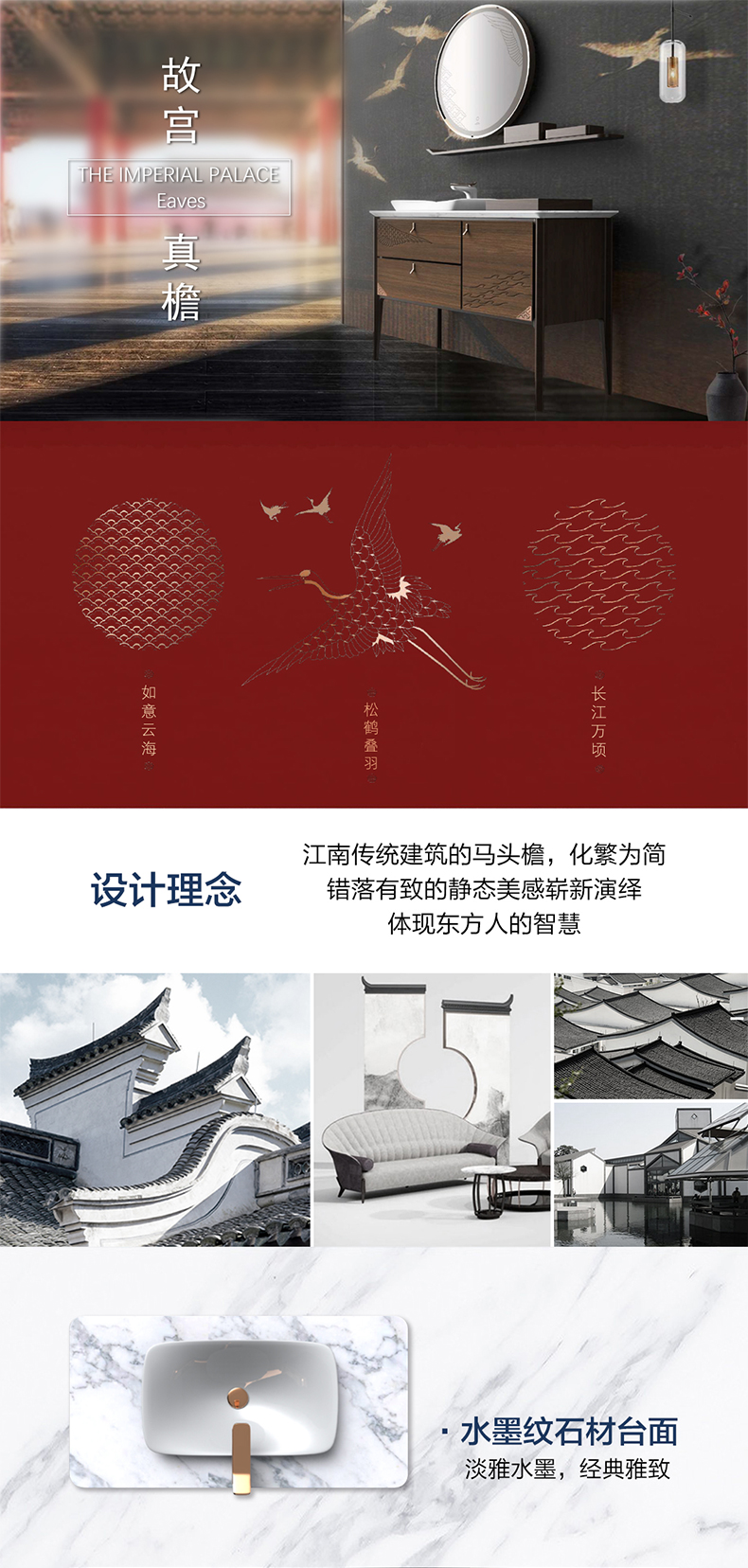 - 汲取仙鹤、祥云、水纹等传统中式宫廷元素,缔造新中式美学卫浴空间;